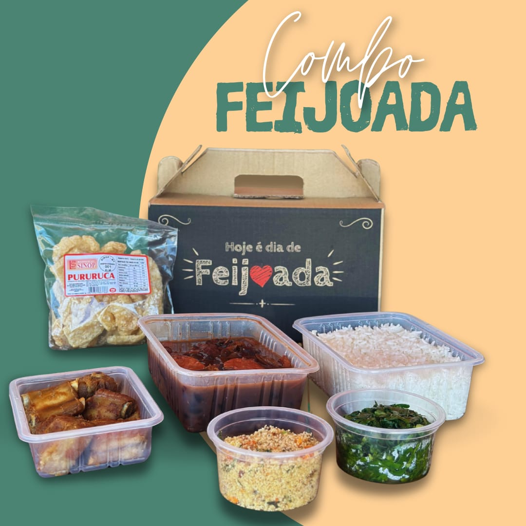 Arroz, feijoada, costela suína, couve, farofa e pururuca. Serve aproximadamente 4 pessoas.