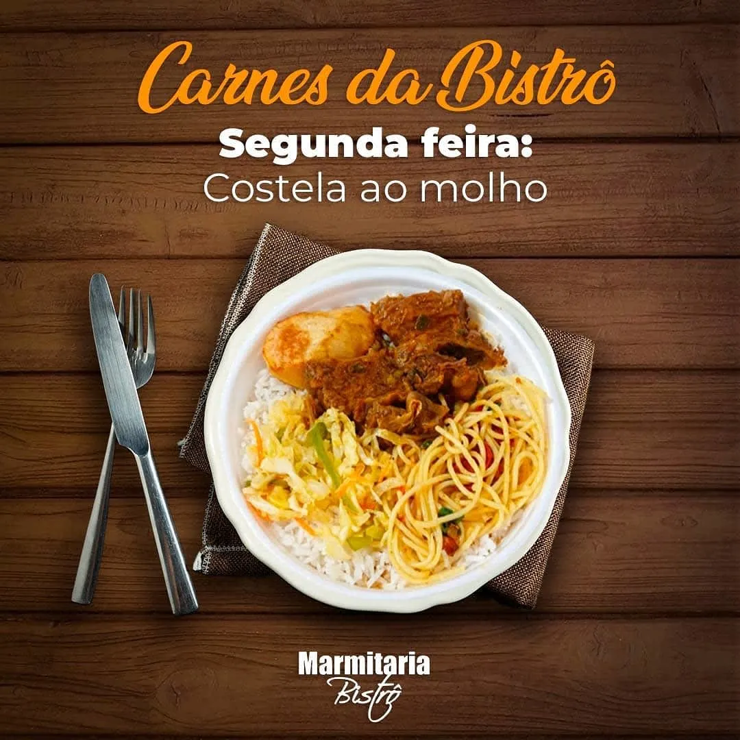 Arroz, Feijão Branco, Costela ao molho, Macarrão com bacon, Salada de batata, Repolho refogado.